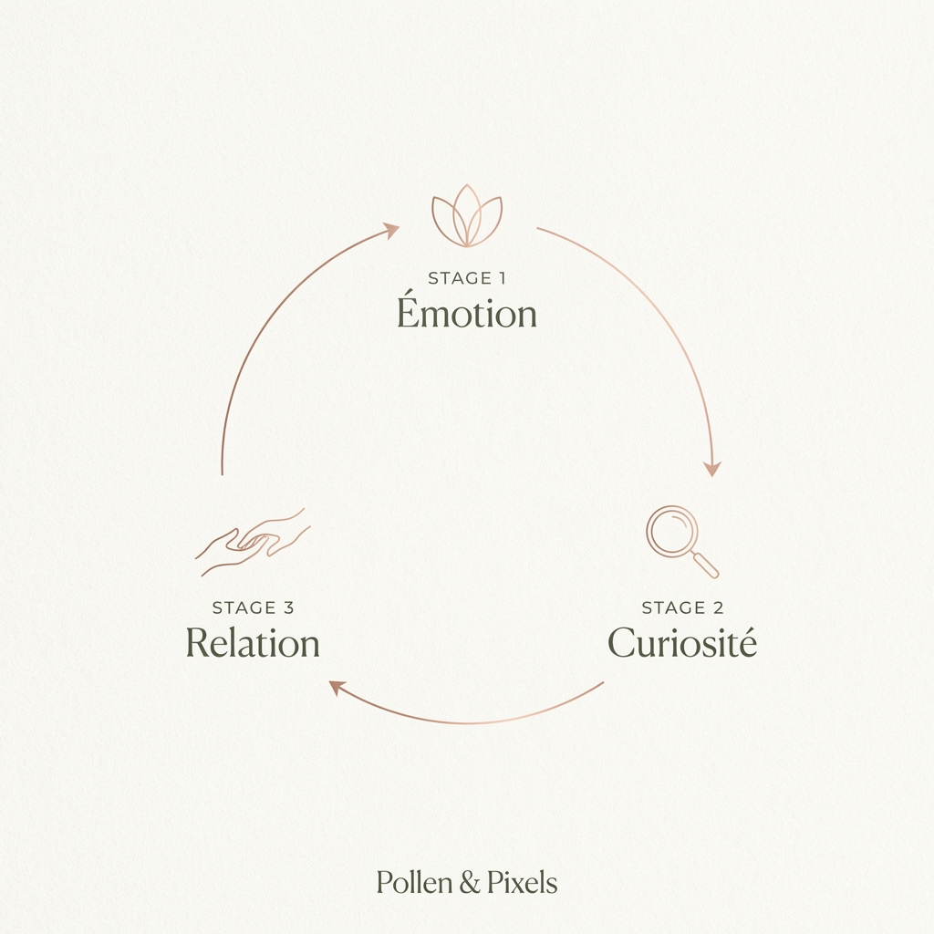 Pour arrêter le défilement, votre contenu doit suivre une logique implacable que j'appelle la Boucle de l'Attention. Tout commence par l'émotion. Ce n'est pas forcément une émotion forte, cela peut être la douceur d'une couleur ou le contraste saisissant d'une texture. C'est l'impact visuel immédiat qui fait dire au cerveau : "Attends, il y a quelque chose de différent ici".